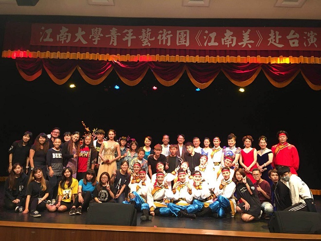 应台湾周凯剧场基金会邀请、中华文化联谊会组派,江南大学青年艺术团于2017年10月28日至11月6日赴台巡演《江南美》专场晚会。晚会由香港六合彩官网资料 副院长符姗姗教授担任总导演,音乐、舞蹈专业师生共20人参加演出。图一 合影 自10月28日起,江南大学青年艺术团分别前往花莲市民中心、台东市民中心、高雄高苑科技大学、树德科技大学等地,进行了四场交流演出。我校师生的演出呈现出歌与乐的结合、琴与舞的交融,以及富有江南特色的中国...