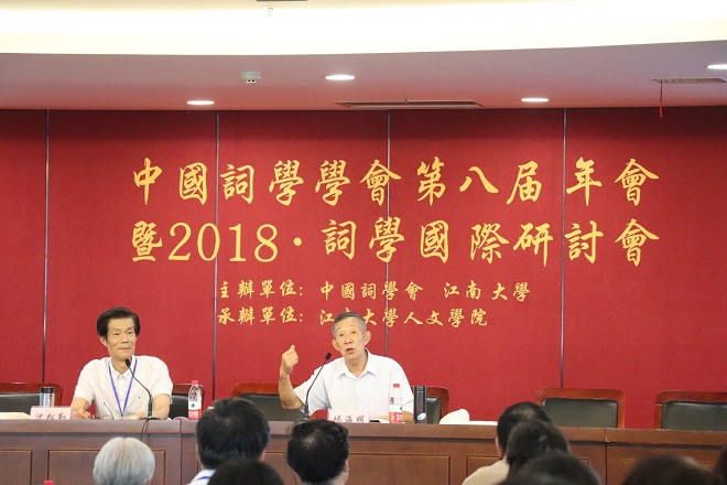 副院长杨晖教授担任主持人,江南大学吴正国副校长出席会议开幕式并致辞,中国词学会会长、中南民族大学文学与新闻传播学院王兆鹏教授致辞并宣布大会开幕。随后,举行了对饶宗颐、葛渭君、邓乔彬、王步高四位先生的致敬仪式;在大会的第一场主题发言中,路成文教授、林佳蓉教授、陈水云教授、橘千早讲师、黄晓丹副教授分别做了主题报告,杨海明教授、程郁缀教授、陶文鹏研究院、施议对教授、孙克强教授分别作了评议。下午,在大会的第二场主题发言中,江弱水教授、傅宇斌教授、田玉琪教授、叶晔教授、曹辛华教授分别做了主题报告,杨雨教授、姚蓉教授、朱德慈教授、高峰教授、张文利教授分别做了评议。