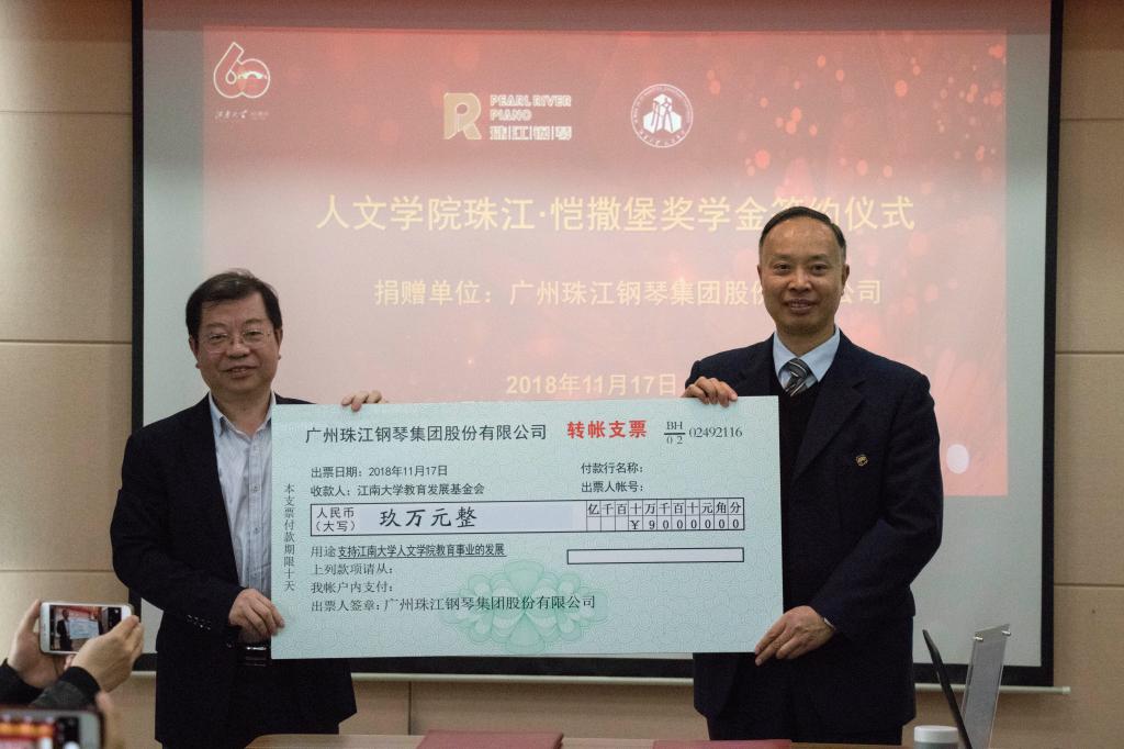 接着,钞爱明先生对江南大学甲子校庆表示祝贺。他希望能够以此奖学金为平台,把企业的音乐艺术资源带给更多的同学。他还提到了此次公司特别赞助了恺撒堡三角琴供江南大学校庆师生文艺汇演表演使用。这台钢琴曾在杭州G20峰会、央视春晚等重要晚会上被使用过,是名副其实的“网红钢琴”,代表了珠江钢琴集团对江南大学的支持。