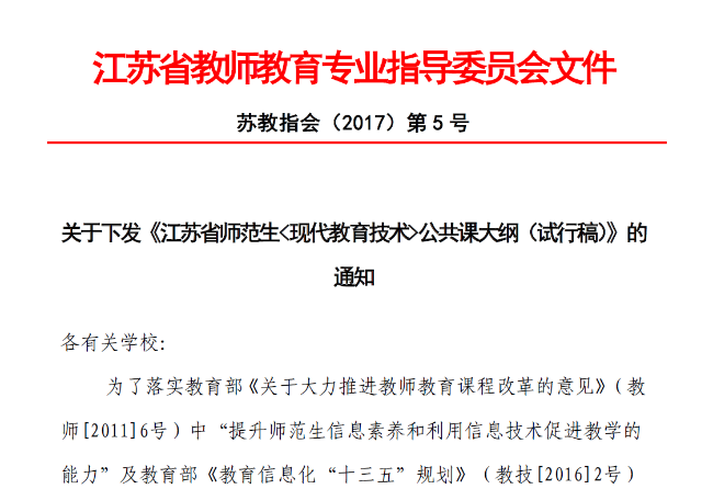 为了落实教育部《关于大力推进教师教育课程改革的意见》(教师[2011]6号)中“提升师范生信息素养和利用信息技术促进教学的能力”及教育部《教育信息化“十三五”规划》(教技[2016]2号)中“将信息化教学能力培养纳入师范生培养课程体系”精神,全面提高江苏省教师教育质量,促进江苏省师范生现代教育技术能力的有效培养,规范和引领江苏省师范生现代教育技术公共课教学实践,江苏省教育厅委托陈明选教授组织研制了《江苏省师范生<现代教育技术>公共课大纲》。