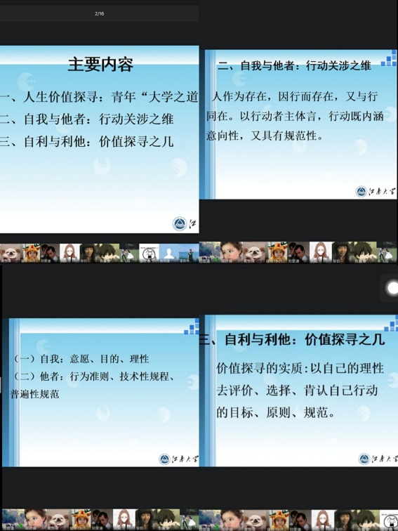 包老师首先从青年的人生价值追寻是青年的大学之道入手,详细阐述为何要追寻人生价值。面对人类自身的种种局限以及所面临的生存困境,追寻人生价值,使得人与自然与社会达到一种自然的和谐。他引用杨国荣先生的话,形象地讲述了人的行动对自己与他人的重要性。包老师讲到人的行动关涉两个方面——自我与他者。人类通过自我意愿、目的、理性来获得自我认可的同时,也要遵守行为准则来规范其行为。结合在这场抗击疫情的战斗中涌现的青年人相应号召,积极投身各项防疫工作的感人事例,包老师从“自利与利他”方面入手,详细阐述了价值探寻的实质——青春最大的价值莫过于个人成长与祖国进步同向而行。
