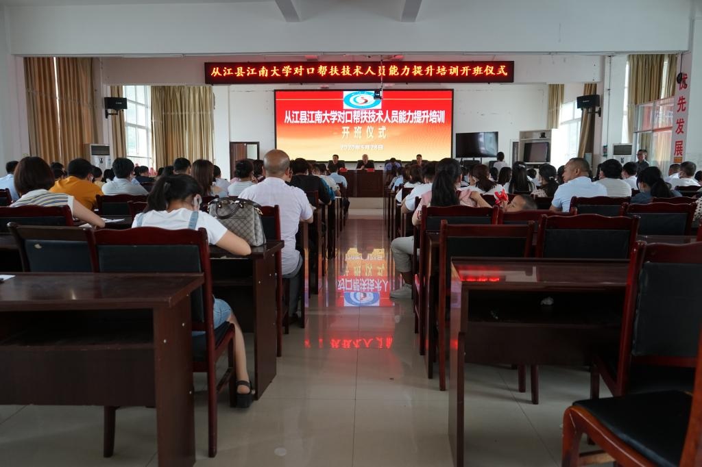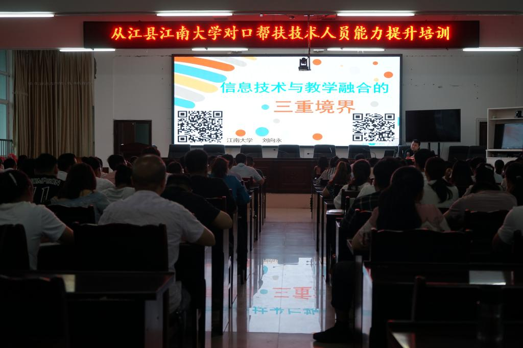 为深入贯彻落实教育部关于部属高校助力决战决胜脱贫攻坚的重大决策部署,根据学校统筹安排,5月28日,江南大学对口帮扶从江县技术人员能力提升班在从江县教育局开班。江南大学挂职干部、从江县委常委、副县长戴建明,从江县教育局副局长陆光华出席开班仪式。我院教育系徐兆洋副教授、教育技术系刘向永副教授分别为全体学员作了专题培训,拉开了从江扶贫培训项目序幕。从江县江南大学定点帮扶专班成员及从江县各乡镇150余名小学教师参加了培训。