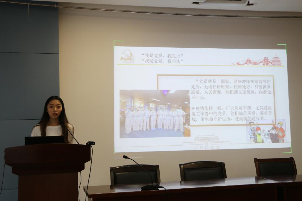 青年党员主动担当,奉献在抗击疫情的第一线。接着,优秀抗疫志愿者代表费诗然、陈金艳陆续分享了自己的抗疫故事,她们深刻体会到党员在抗击疫情中冲锋在前的义无反顾与责任担当。深受感动的同时,更主动参与到自己社区的抗疫志愿活动中,进行测量体温、宣传抗疫知识等工作,践行“从群众中来 到群众中去”,以服务诠释职责。