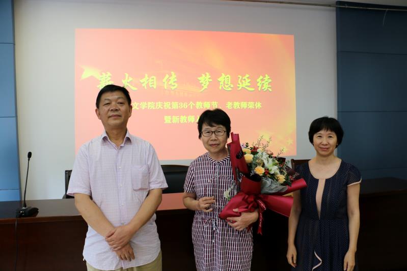 学院今年上半年有两位教师退休,她们是中文系的陈平老师和任翌老师。首先由中文系主任张春梅教授介绍了两位荣休教师的基本情况,并对她们为学校和学生成长所做的奉献表示感谢,对她们光荣退休致以敬意和祝福。荣休教师代表陈平发表荣休感言,并对年轻教师寄予了希望和表达了祝福。学院领导姚剑英、田良臣为荣休教师颁发纪念品并献花合影留念。