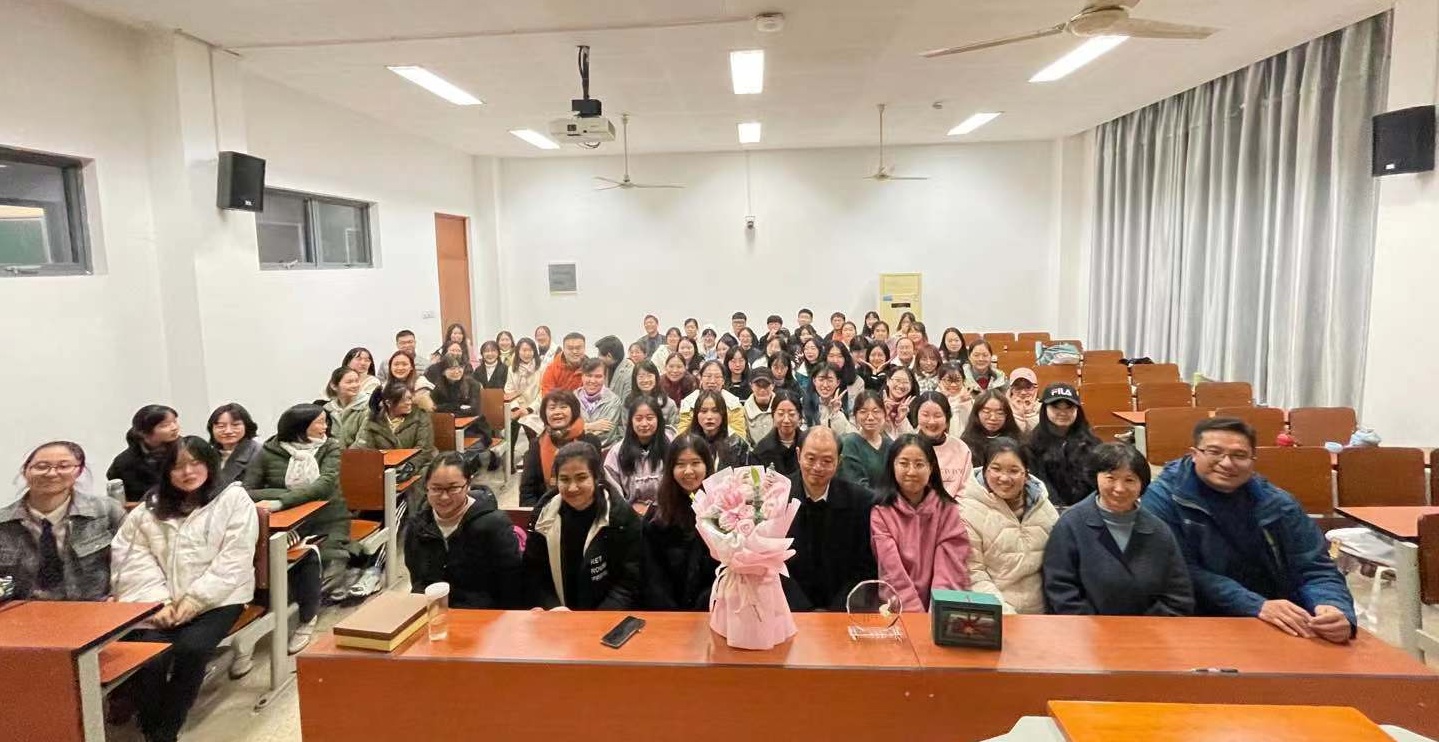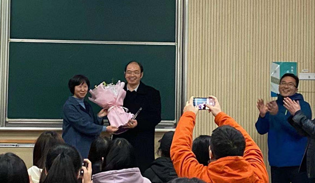 教育系尧新瑜教授教师职业生涯的最后一堂课,教育系党支部、工会小组课后在教室里为尧老师组织了一场隆重的荣休仪式,学院党委书记姚剑英、副院长(主持工作)田良臣和教育系全体老师、全体修课学生共同参加了仪式。