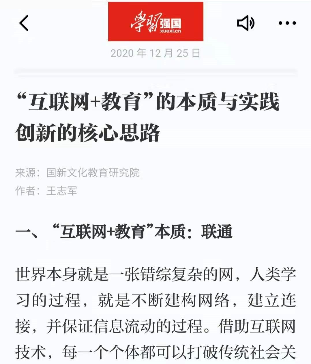 教育技术系王志军副教授应“国新文化教育研究院”的邀请,在《学习强国》平台上发表《“互联网+教育”的本质和实践创新核心思路》一文。