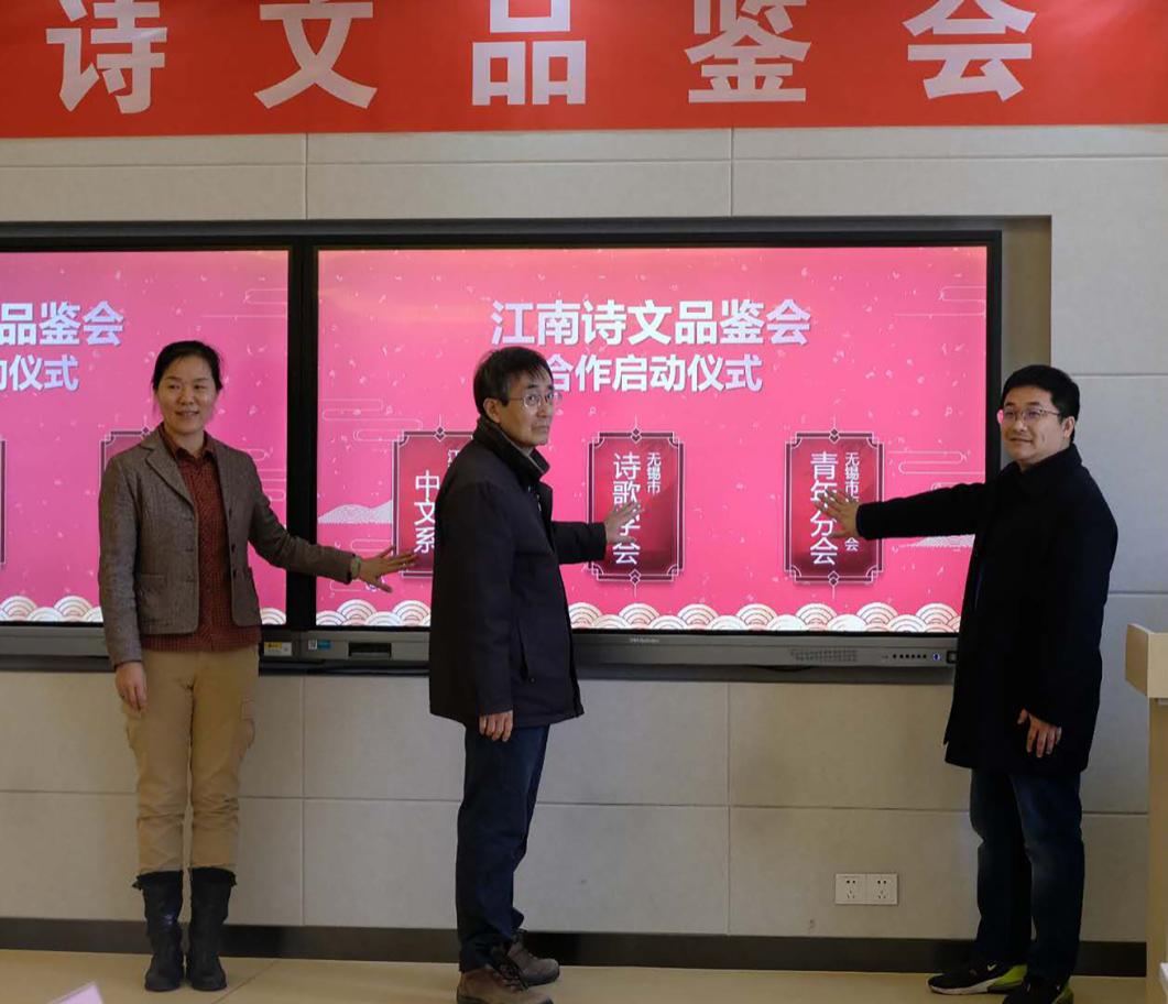 随后,举行“江南诗文品鉴会” 启动仪式。金山先生、张春梅教授、陈佳冀副教授,共同上台,启动“江南诗文品鉴会”活动项目。启动仪式标志着本次诗文品鉴会的开始,是江南大学中文系、无锡市诗歌学会、无锡市作家协会青年分会三者之间紧密联系的建立,更意味着老中青三代文学创作者通过活动彼此联系、共同进步的美好未来愿景。这对于无锡市的新一代文学创作者的发展,以及江南大学中文系对学生的深入培养都有着积极作用。