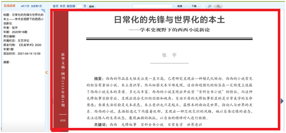 此篇论文首发于《东吴学术》(2020年第1期),作者张宇老师选取学术史视角来探讨香港作家的写作,将其纳入中国当代文学的研究领域,以日常化/世界化这一极富张力的表述打破了当下对于西西创作研究的模式化倾向,因此是一篇富有创见的优秀学术论文。《新华文摘》全文转载是对此文价值的肯定。