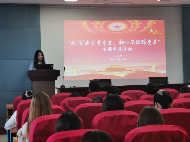 活动伊始,团支部书记首先就系列团日活动的整体方案进行了介绍。汉语1903团支部创新党史学习形式,以建党百年历程中中国共产党人的书信为载体进行党史学习。通过发动全体团员青年搜集红色书信学习党史,通过诵读书信和解读书信的撰写背景感受共产党人的初心使命,通过写一封信《寄给未来在党旗下宣誓的自己》,促进团内思想交流,引导团员青年树立远大理想,投身强国伟业。