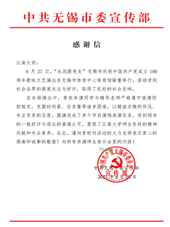 音乐系、舞蹈系师生参加“永远跟党走”无锡市庆祝中国共产党成立100周年歌咏文艺演出,师生的优异表现受到了中共无锡市委宣传部充分肯定,市委宣传部特致信江南大学表示感谢。
