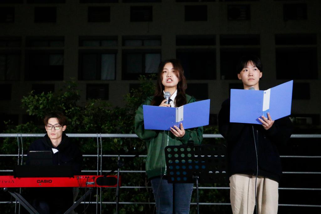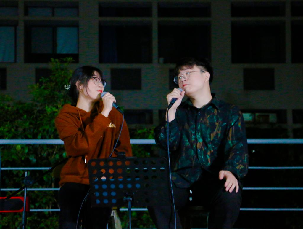 音乐会伊始,吴听旭、刘安琪、徐子寒同学带来暖场舞《踏春》,青丝墨染,水袖飘逸,婀娜的舞姿瞬间点燃全场氛围。演出的第一个部分为“星星之火”,由四个节目组成。祝三卿同学给观众带来钢琴弹唱《我们》,把思念化作祝福,表达了珍惜现在所拥有的一切的美好祝愿。仰莞尔同学深情演唱《这世界那么多人》,用歌声唱出这世界那么多人,有你一个就足够的真挚情感。刘宁、朱奕驰、康振鹏同学合作演出《爱爱爱》,轻快的曲调,丝丝入扣的感情,是一腔沉淀的深情。乔益铭同学倾情演唱《七里香》,让人回想起年少时羞涩而又甜蜜的爱情。