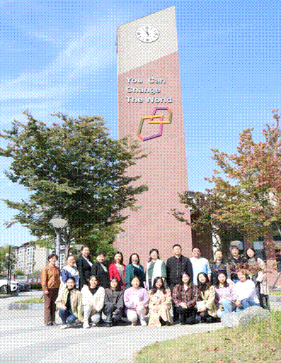 双方学校集体参会教师及江南大学实习教师在滨湖双语实验中学钟楼下合影
