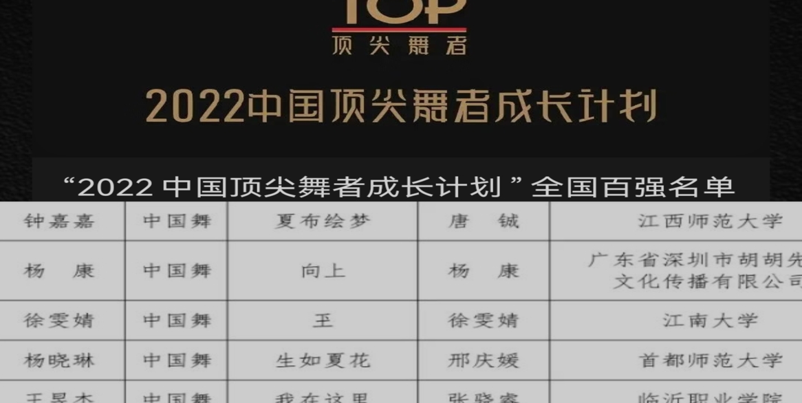 我院舞蹈系2021级舞蹈编导专业学生徐雯婧,于今年7月代表江南大学参加中国舞蹈家协会举办的“顶尖舞者成长计划”,近日成功入围全国百强,为我校争光。