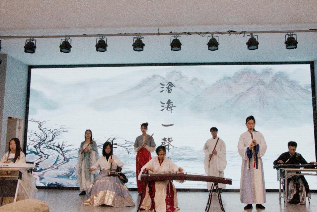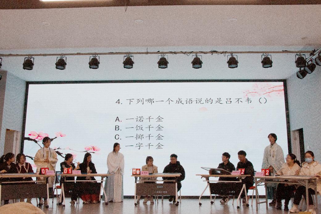 、食品学院、外国语学院、物联网学院等学院的10名同学进入到决赛环节。活动伊始,随着缘韵笛箫社带来的民乐合奏《沧海一声笑》,比赛也拉开序幕。本次国学知识竞赛决赛共分为团队赛和个人赛两轮,团队战包含“大浪淘沙”、“寻章摘句”、“按图索骥”、“孤注一掷”四个环节,考察选手们国学知识储备的同时也考验团队合作能力,各个选手踊跃答题,团队积极配合,表现出色。第一场团队赛在四个紧张刺激的比拼环节结束后,2组积分较高的同学晋级到更为精彩激烈的个人赛。