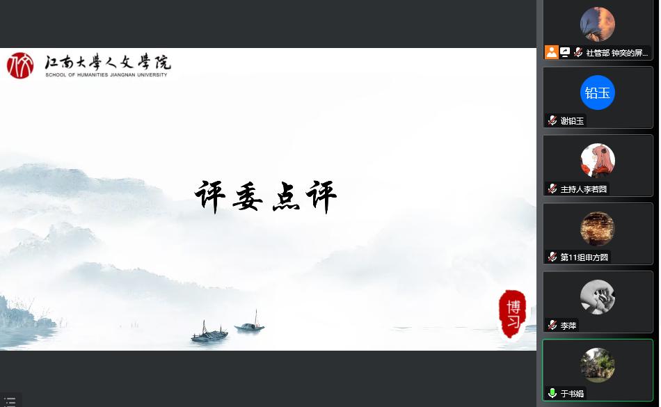 所有团队答辩结束后,于书娟老师进行了总结点评,她首先对同学们的创意和表现表示了肯定,并对各个团队提出了三点希望,一是体现社区教育的独特性,要立足社区、服务社区、面向社区、依靠社区,从社区的需求入手进行课程设计;二是要体现专业品质,要有专业意识,以课程设计的专业理论及方法继续打磨各项课程,提升专业性;三是要以研究的态度、务实的态度,合作实践此次社区教育,重视课程落地。她还对“博习”社区教育提出了展望,希望“博习”社区教育能从社区走向社会,秉持教育是为了人个性、完满的生活这一理念,打造兼具趣味性、美育性、人文特色的,促进人的全面发展的课程体系。