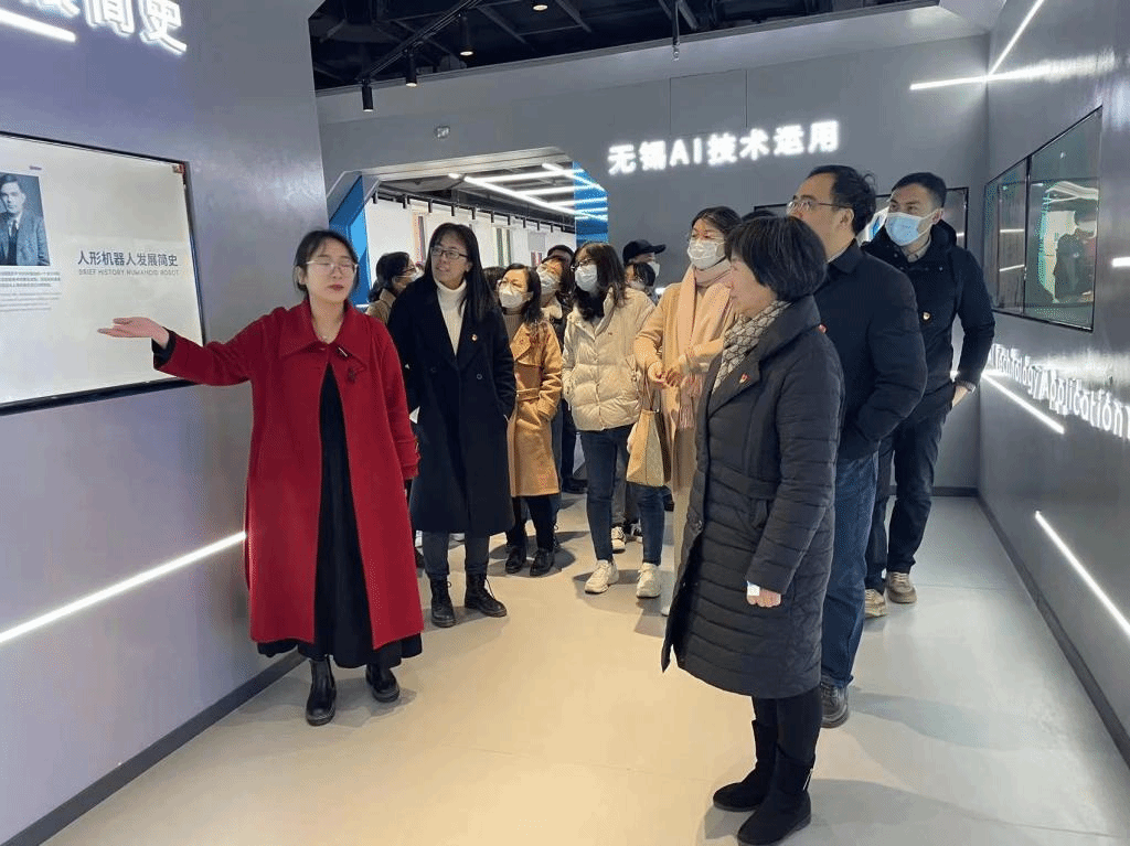 一行首先参观了经开区人工智能教育基地,作为全省唯一一个建在校内的人工智能教育基地,是集教、学、研、展、赛为一体的多功能开放式“科技空间站”。师生党员通过参观互动体验,对于紧随时代前沿,创新育人模式,办好人民满意的教育有了更深的体会。