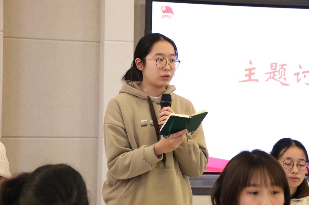 团日活动首先由张璇领学《论教育》一书中“做党和人民满意的好老师”篇章。她从习近平总书记在同北京师范大学师生代表座谈时的重要讲话切入,结合“人民教育家”于漪老师、2023年“感动中国年度人物”刘伶俐老师的感人事迹,分享了自己的看法。随后,支部同学沈季楠、顾佳艳、孔晨瑜三位同学踊跃发言,分别从“好老师的特质”“好老师的标准”“好老师的使命”分享了自己的学习心得。他们认为,“好老师”没有统一的模式,但有着共同的精神特质,都注重自身内在素养提升,又注重教育教学方式和学生成长成效,并且心怀家国,以天下为己任。