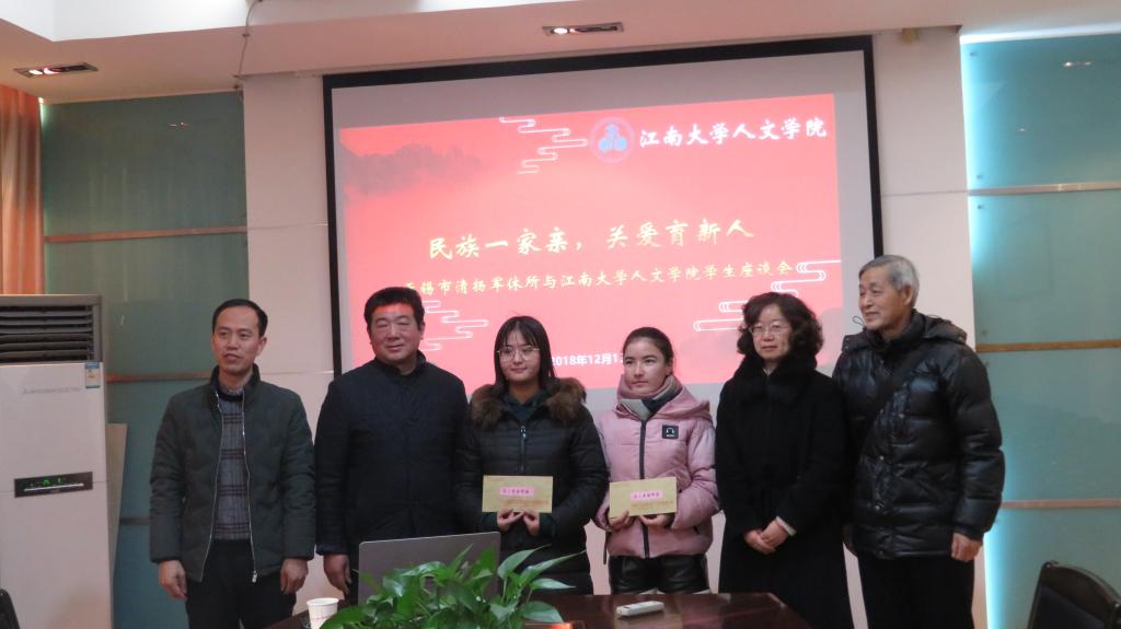 少数民族学生的关爱表示感谢,对两位学生的努力与成绩表示肯定。他表示,学生经过层层选拔考取本校,都是新疆学生中的优秀者,相信通过他们努力,一定能够取得更大的进步,更好地回馈社会。同时,吴书记还表示希望进一步加强与无锡市清扬军休所的交流工作,发挥军休老同志的优势,在人文学子中进行革命传统、爱国主义、集体主义等教育。
