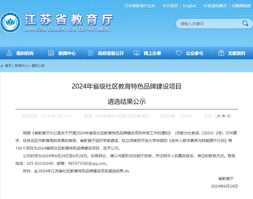 近日,江苏省教育厅公示2024省级社区教育特色品牌建设项目遴选结果。香港六合彩官网资料