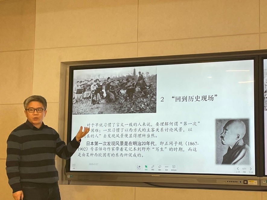 汤拥华开场便强调了文学与理论在研究生学习中的紧密联系,指出理论对于文学研究的重要性。围绕“重申日常概念”“回到历史现场”“发现症结所在”“面向事实本身”“识破关键颠倒”等五个方面出发,汤拥华对风景批评的概念、理论发展以及批评实践进行了介绍。之后,汤拥华还分享了如何在研究生学习中培养问题意识,以及如何运用理论进行文学研究的方法和技巧。