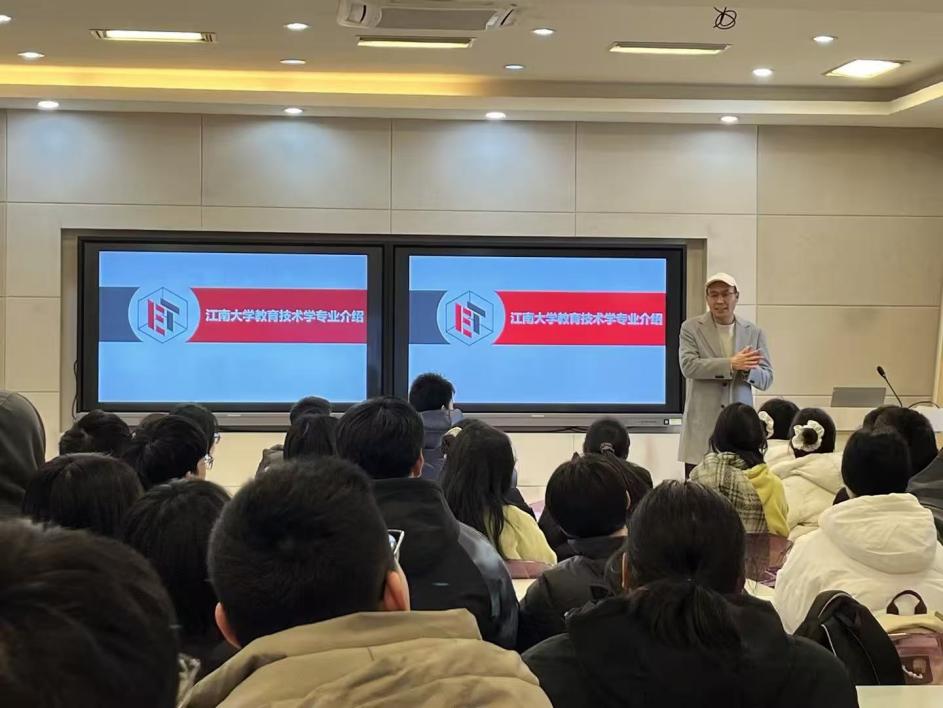 12月25日,无锡一中高一16班学生来院,参加主题为“当教育遇见科技——做面向未来的课堂设计师”的“探秘专业”活动,教育技术系负责接洽。教育技术系副主任牟智佳副教授系统介绍了江南大学教育技术学(智能教育卓越创新班)的特色优势,并重点介绍了该专业的毕业要求、学科课程体系、实践教学环节、专业实践环境以及就业去向。专业优秀学生张若涵从亲身经历出发,详细介绍了个人在专业学习、学生工作、文体活动、下乡支教、教学实践及出国研学等方面的成长与提升,并诚挚欢迎一中学子加入江南大学,在智慧教育时代开启成长新篇章。