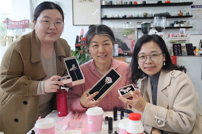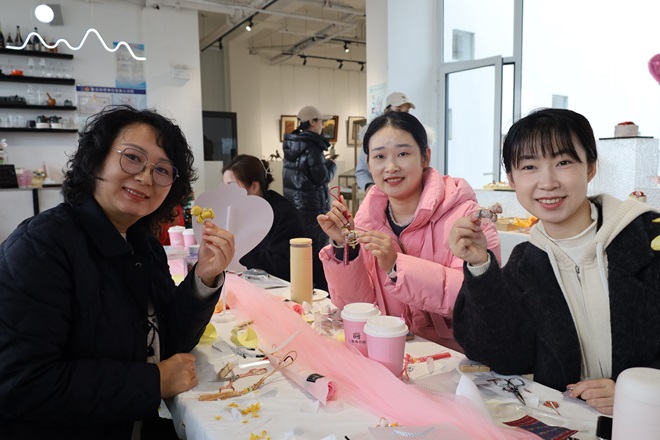 美术馆专业老师首先向老师们简要讲解了包含螺钿镶嵌与宋锦在内的非遗项目深厚的文化内涵和制作工艺特色。其后,老师们或细心挑选五彩的螺钿片,精心镶嵌在胸针、发簪上,感受其流光溢彩的独特魅力;或穿针引线,将精美宋锦与各类配饰巧妙结合,制作出一个个古风雅韵的挂件。指尖流转的是匠心,心间沉淀的是厚重的文化。在沉浸式的体验中,大家不仅领略了非物质文化遗产的博大精深,更在一敲一打、一针一线间舒缓了压力,收获了亲手创作的喜悦。