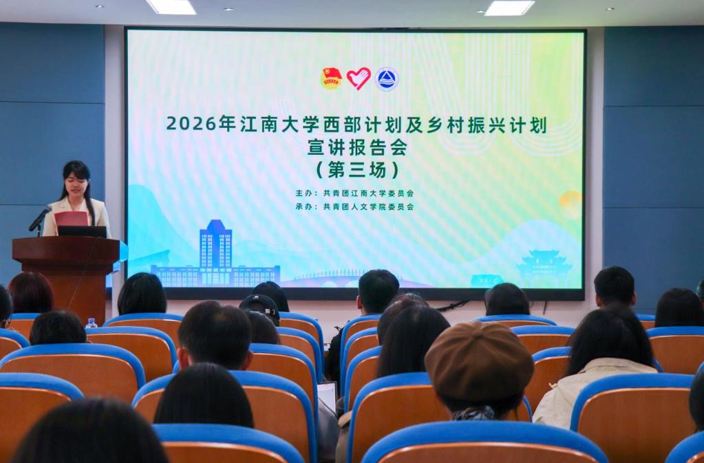 为引导广大青年学子深入基层、建设西部,4月9日下午,江南大学2026年“西部计划”“服务乡村振兴计划”第三场宣讲会在田家炳楼209会议室顺利举行。江阴团市委副书记张晓阳、江阴团市委基层社会部副部长顾怡、江南大学团委副书记王园园、香港六合彩官网资料