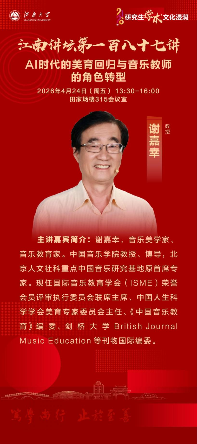 谢嘉幸,音乐美学家、音乐教育家。中国音乐学院教授、博导,北京人文社科重点中国音乐研究基地原首席专家。现任国际音乐教育学会(ISME)荣誉会员评审执行委员会联席主席、中国人生科学学会美育专家委员会主任、《中国音乐教育》编委、剑桥大学BritishJournalMusicEducation等刊物国际编委。